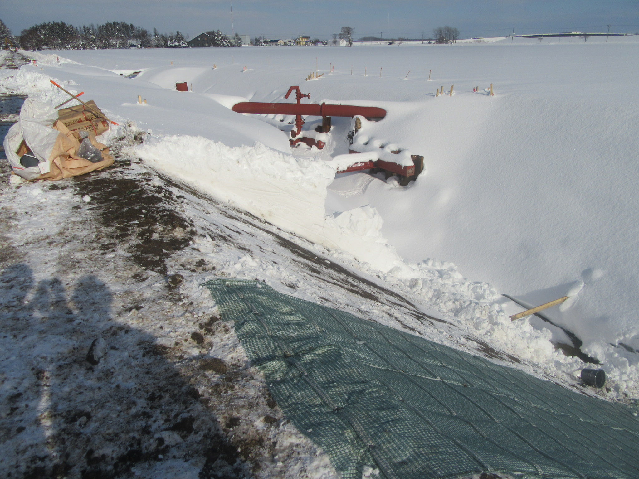 北海道に分布する「泥炭地」土質の法面に使用。 除雪しながら施工し、施工後冠雪しました。 雪解け後、一部凍上箇所も見られましたが、問題なく生育しております。 |