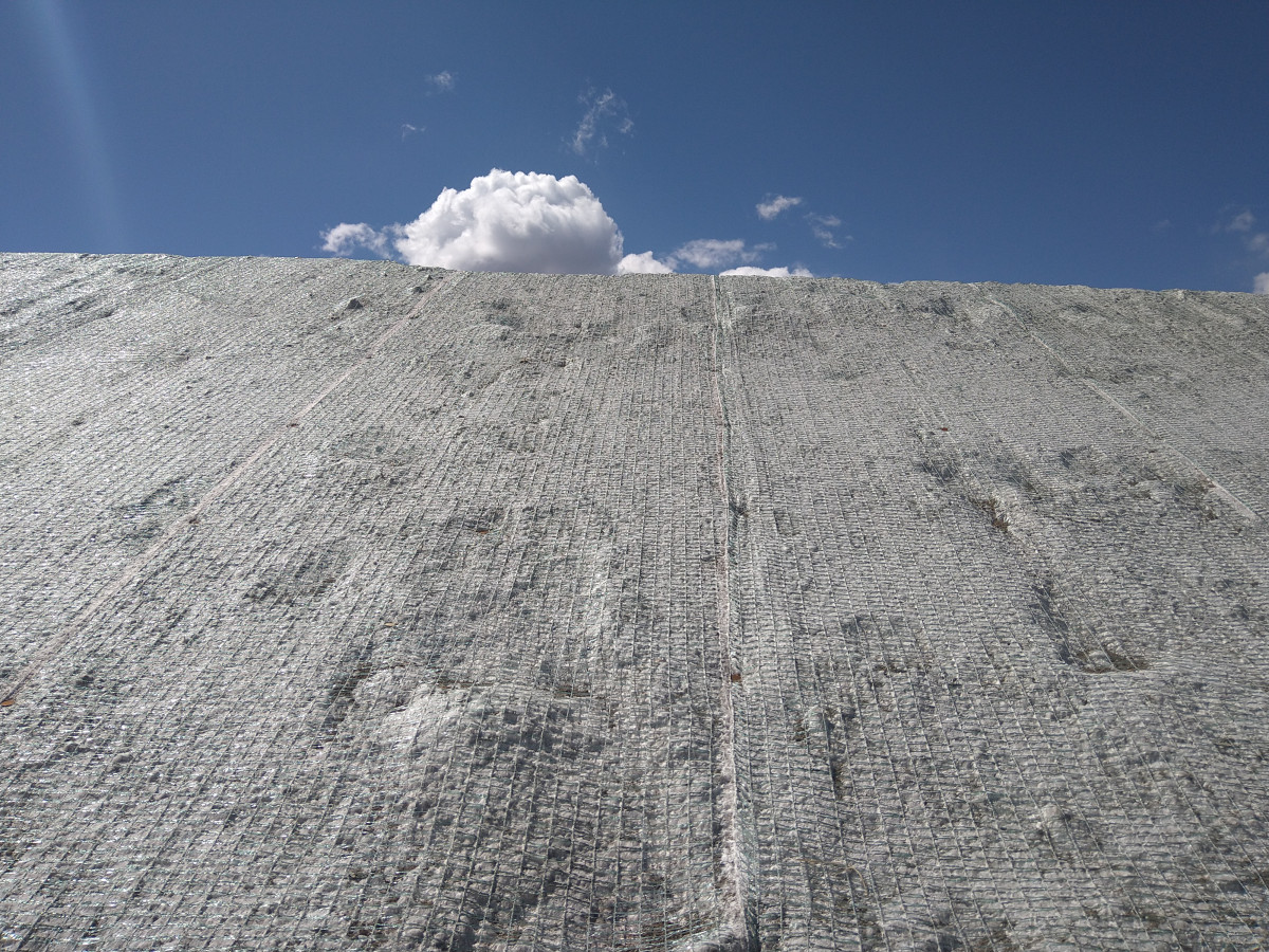 盛土材として地盤改良の吹き上がり土が転用されている現場で、改良材の影響によりpHが8.35のアルカリ性土壌でした。 確実な緑化につなげるため、侵食防止効果の高いキルケット S型に中和剤を配合したものを提案し、採用いただきました。 耐候性不織布が法面の不陸に密着することで侵食を防止、中和剤の効果で順調に植生が進んでおり、自生種の生育も確認できています。 |