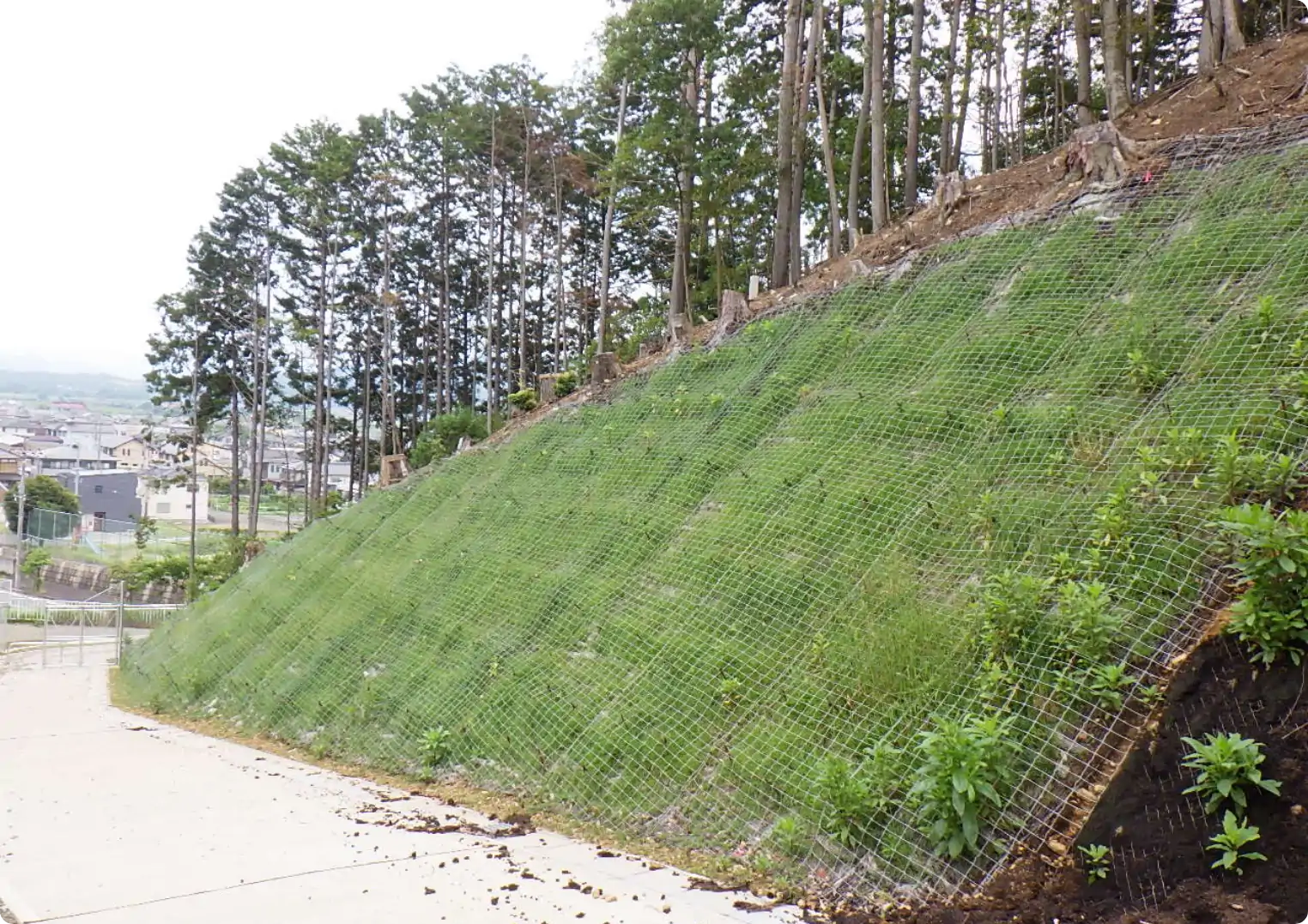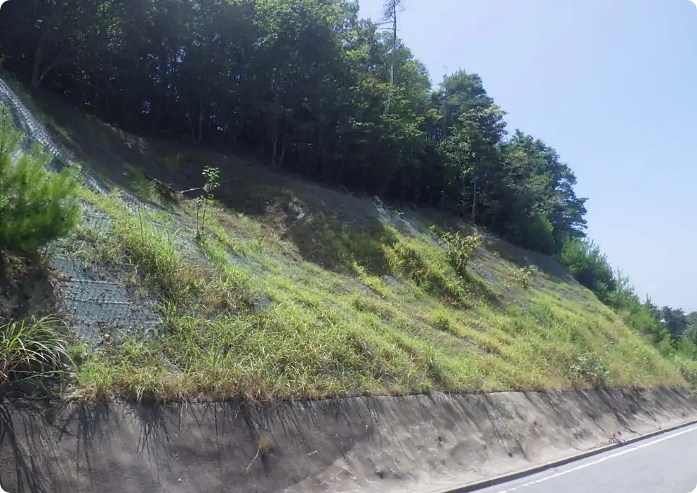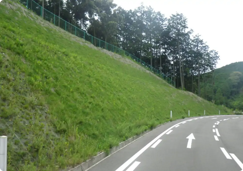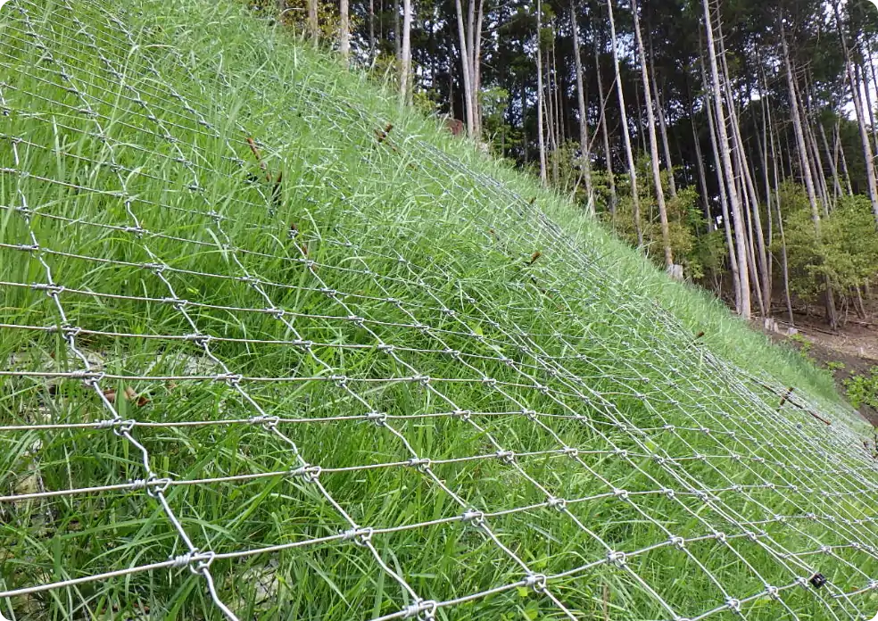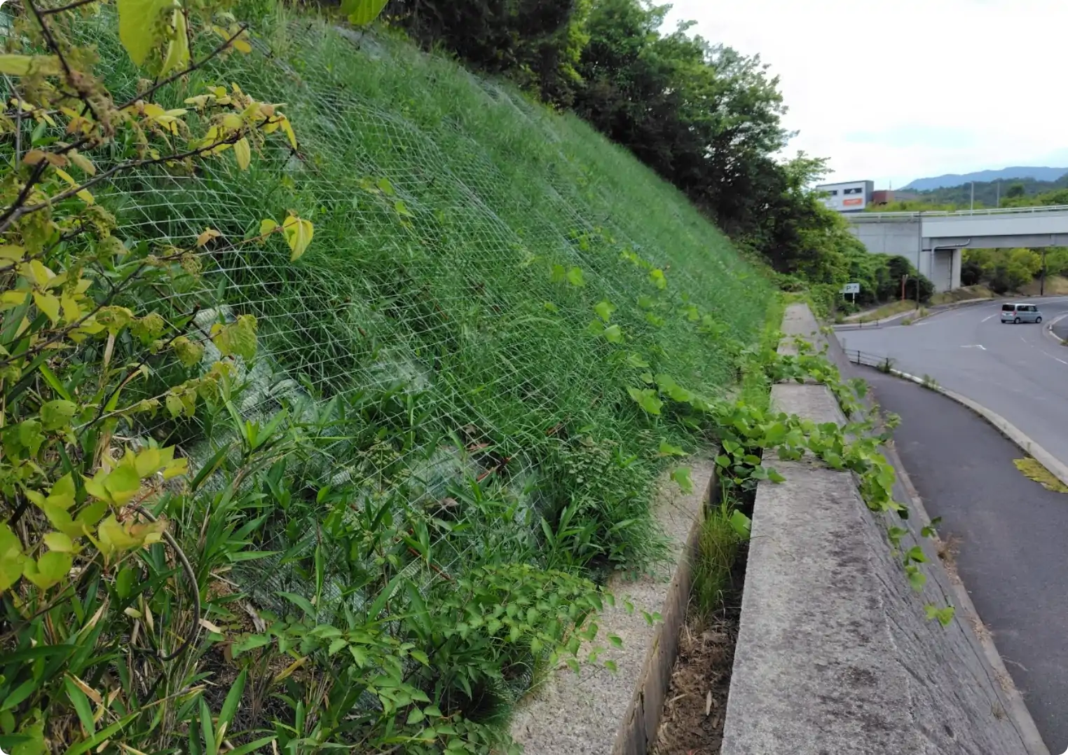 植物の引き抜きによる枯死を少なくし、不嗜好性植物の成長を助けます。厚層金網による被覆で、中長期的な法面保護が可能です。