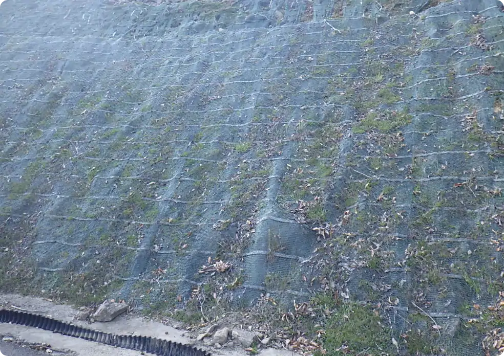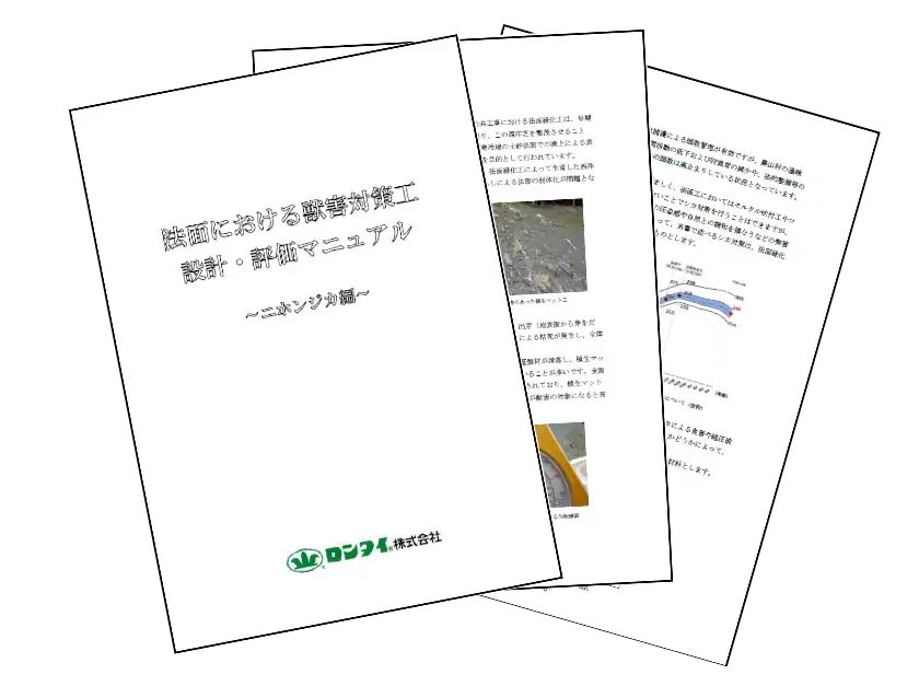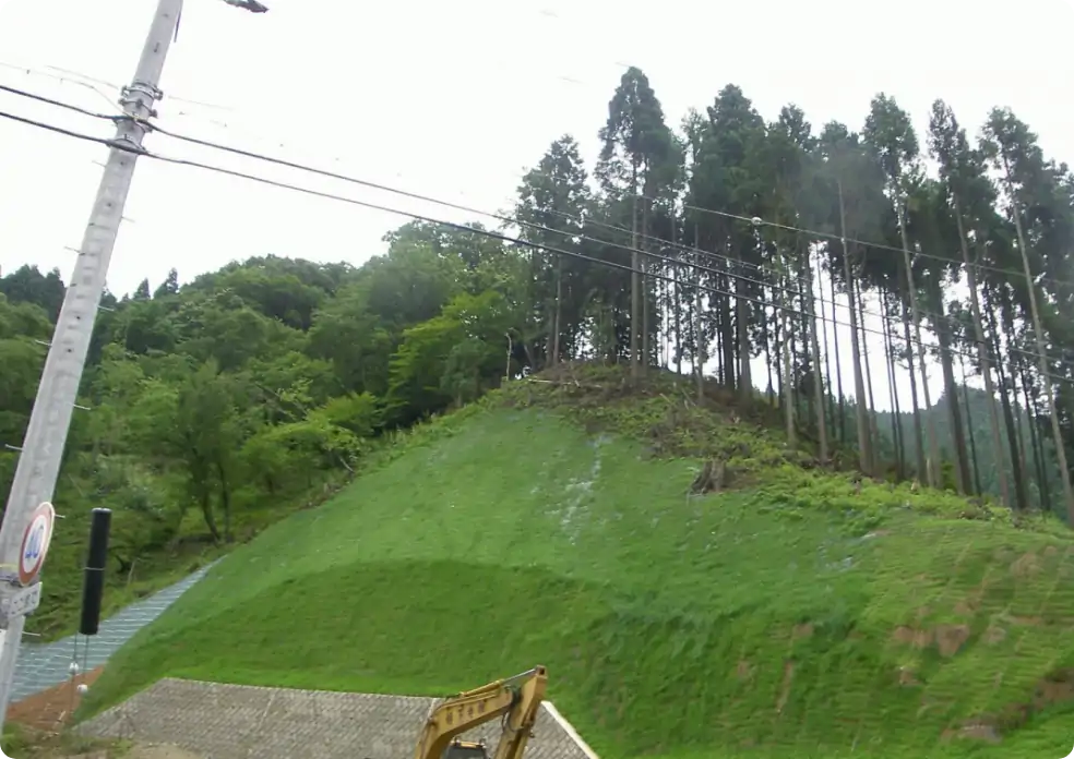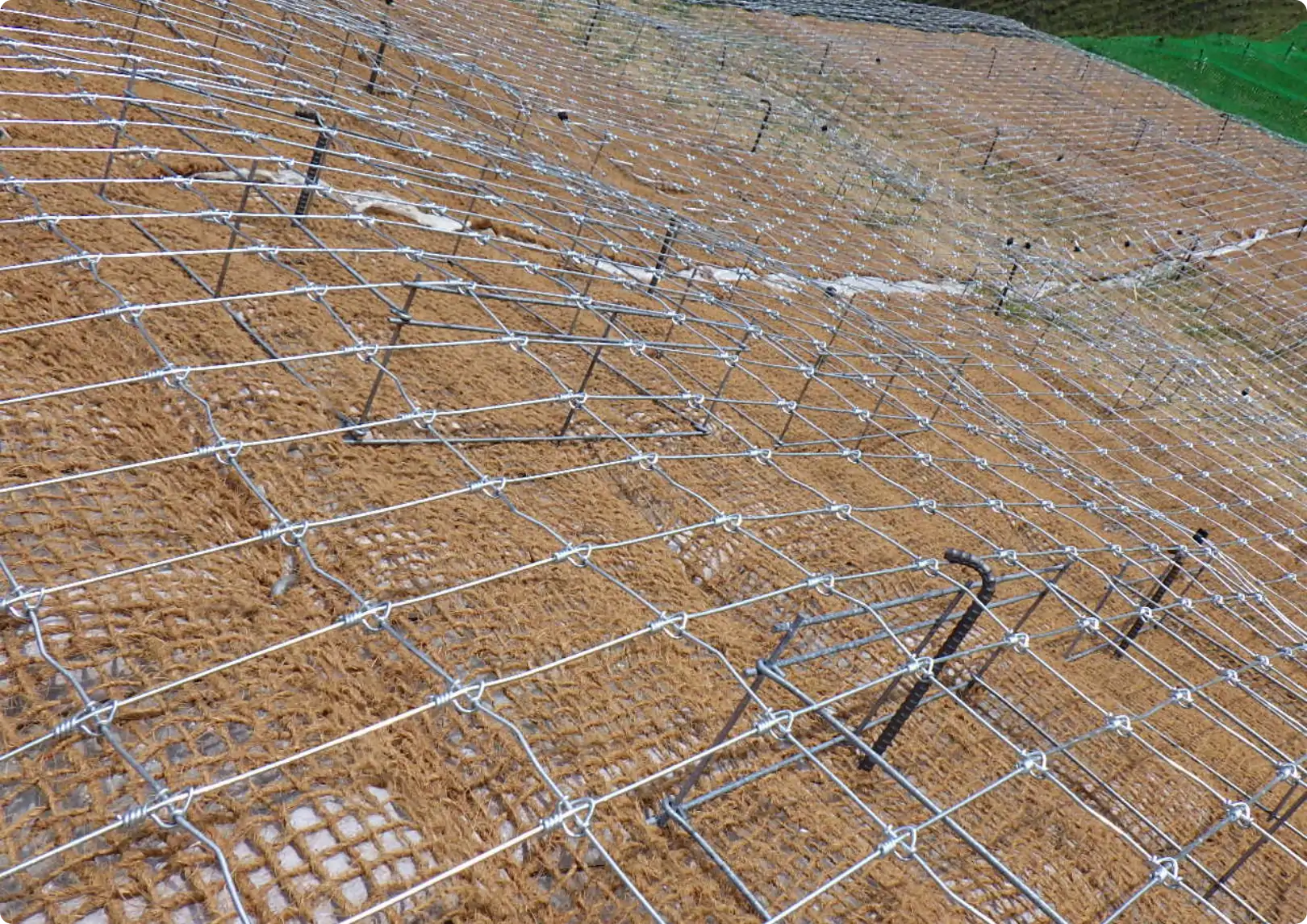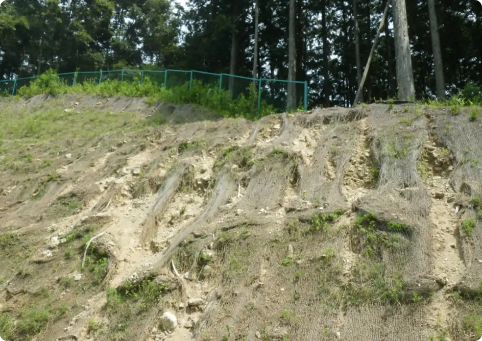 植物の引き抜きによる枯死を少なくし、不嗜好性植物の成長を助けます。厚層金網による被覆で、中長期的な法面保護が可能です。