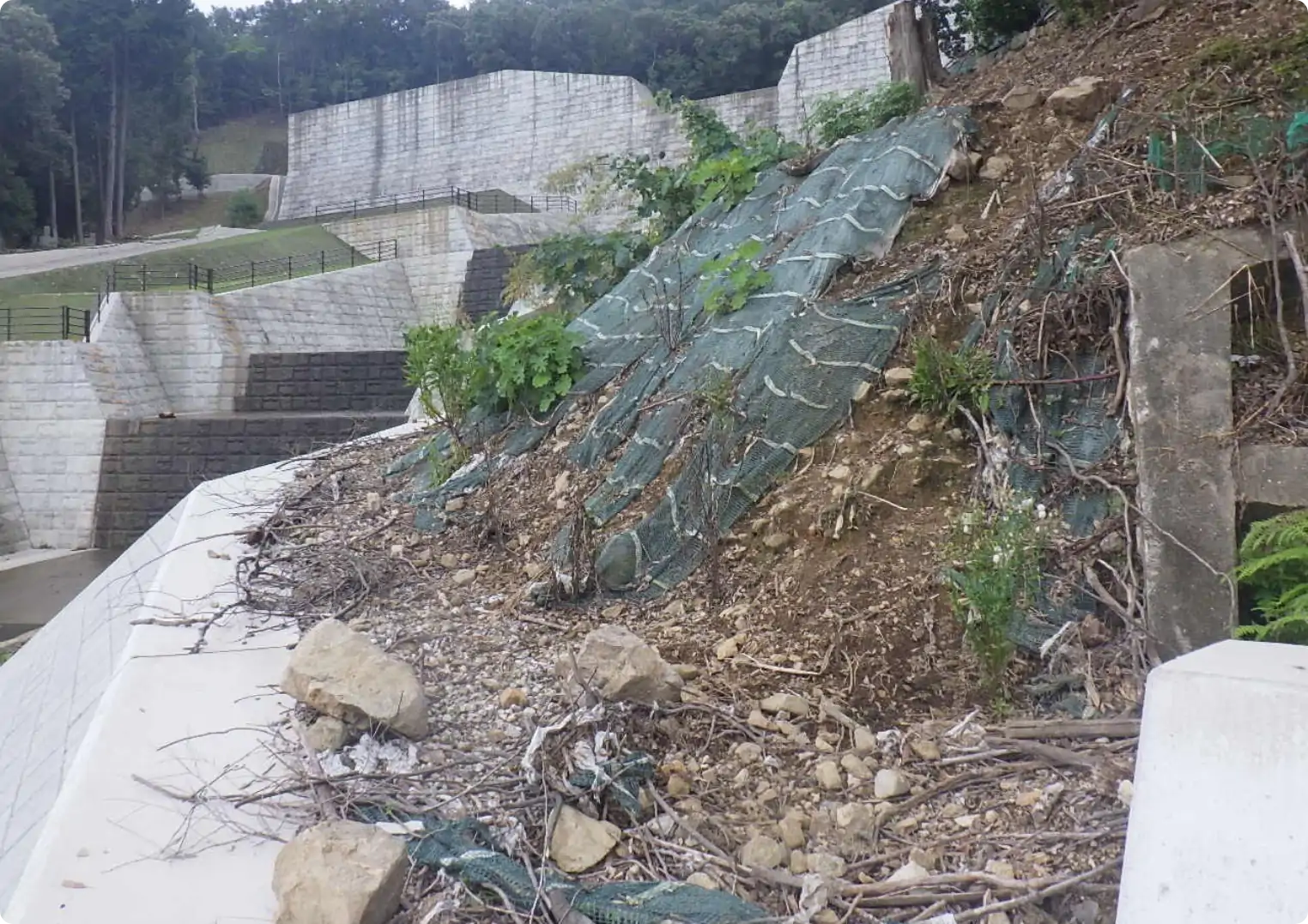 法面上で台座を打設し、金網を浮かせて設置するため、工程はやや延びます。