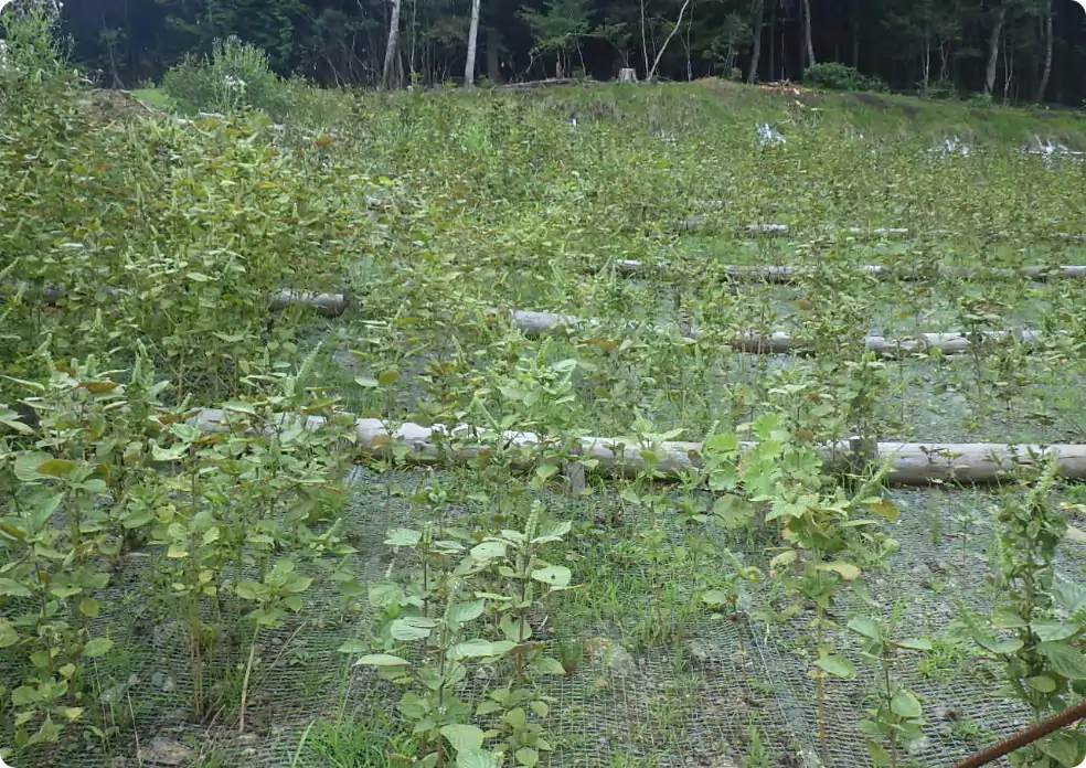 金網でシカによる踏み荒らしや食害を防止する緑化基礎工と、 ロンタイオリジナルの不嗜好性植物播種工の組み合わせにより、シカ獣害対策の効果を最大限に発揮します!