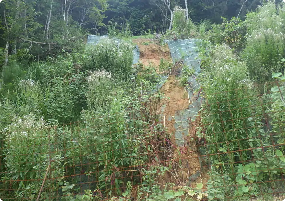 シカが生息している地域の現場で獣害対策を行わないと、踏み荒らしや食害により表層侵食が抑えられず、植生マット本来の緑化機能が発揮できません。生育基盤が剥がれ落ち、そのまま法面が風化することで、二次災害を引き起こす可能性があります。