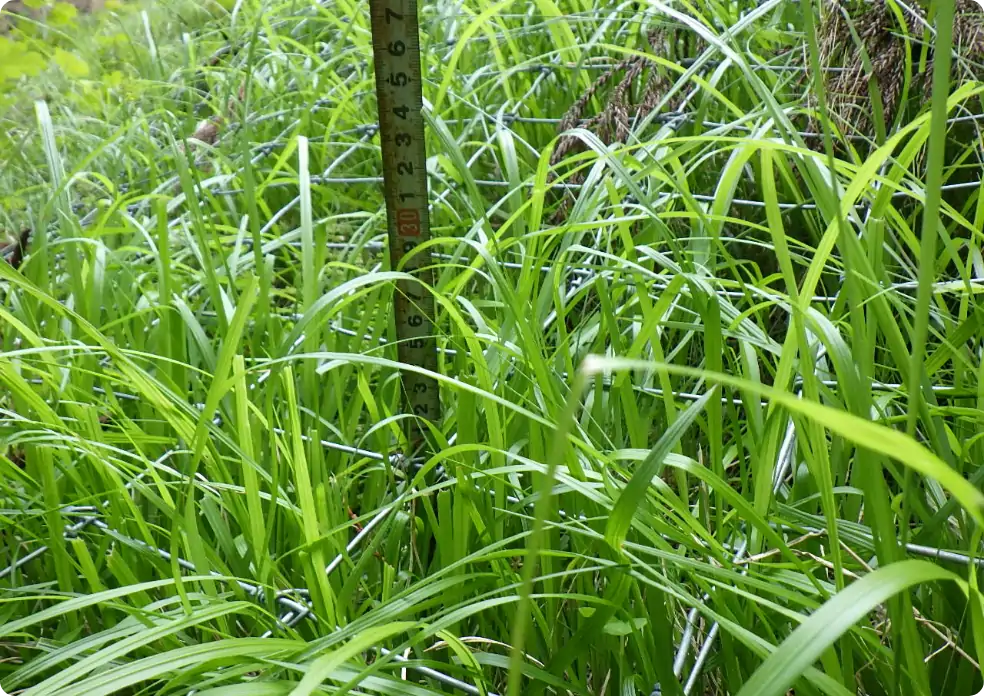 金網を浮かせて設置することでシカの侵入を防ぎ、踏み荒らしや食害の防止に高い効果を発揮します。浮説金網の高さを超えた葉先は若干の食害が発生しますが、植物が根をしっかり張り法面を守ります。
